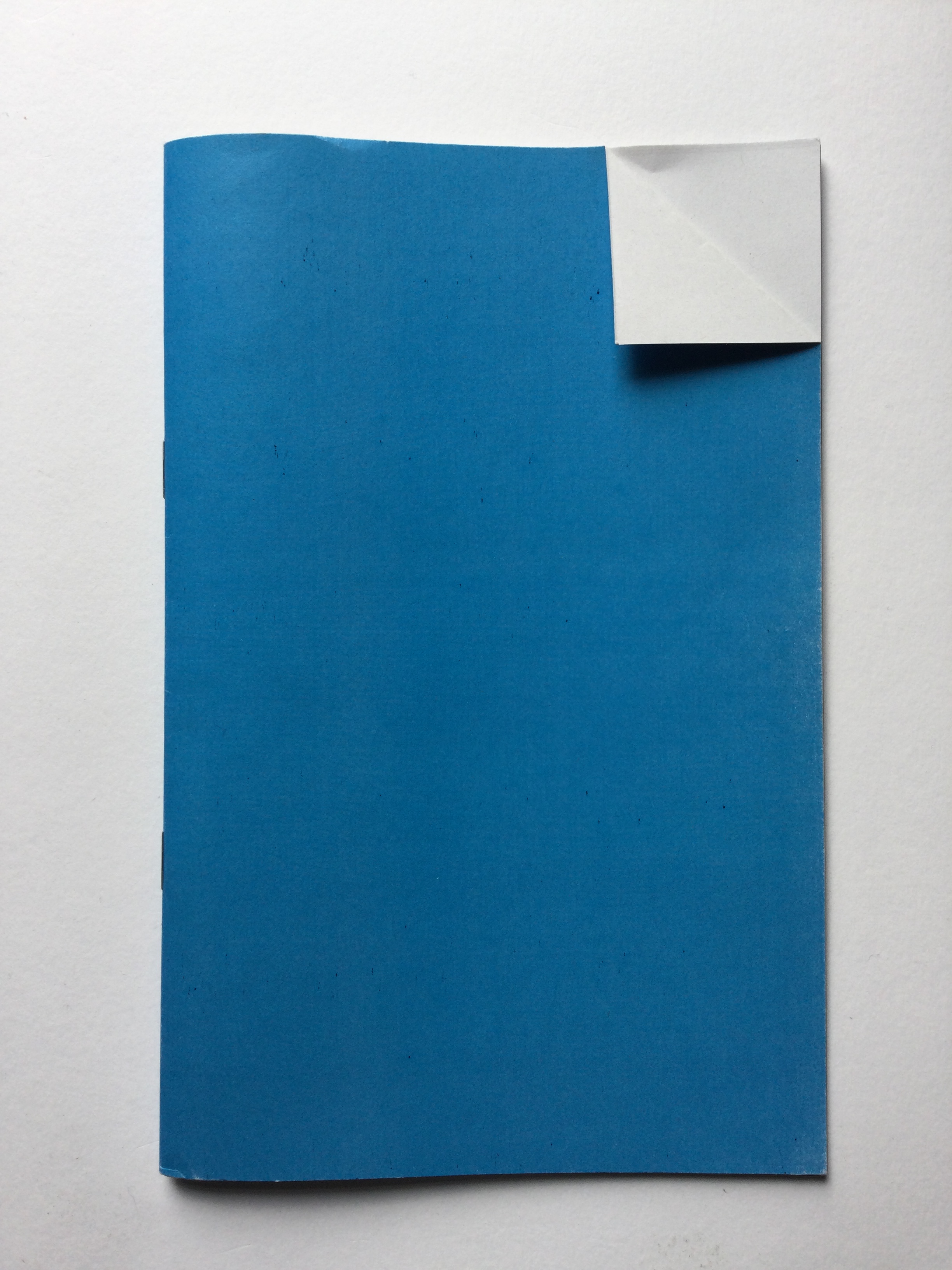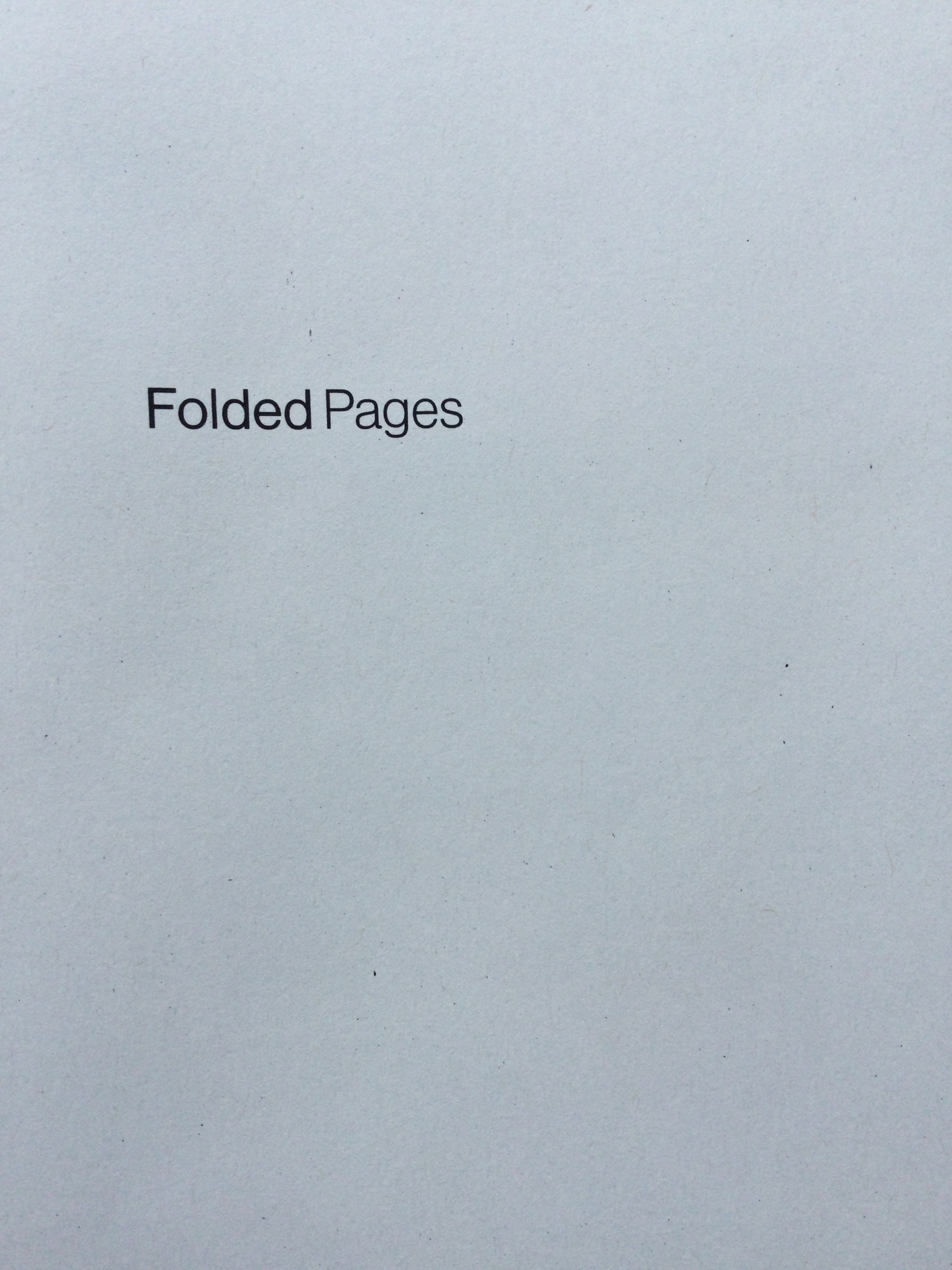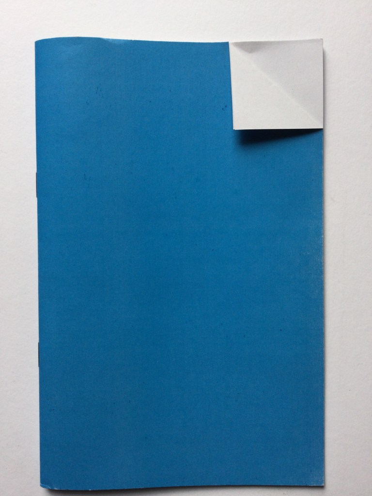 Folded pages is a limited edition of 60 copies. Printed on 100 gsm context natural paper with a plain blue dog eared cover on 170 gsm paper. 210 x 135 mm.
