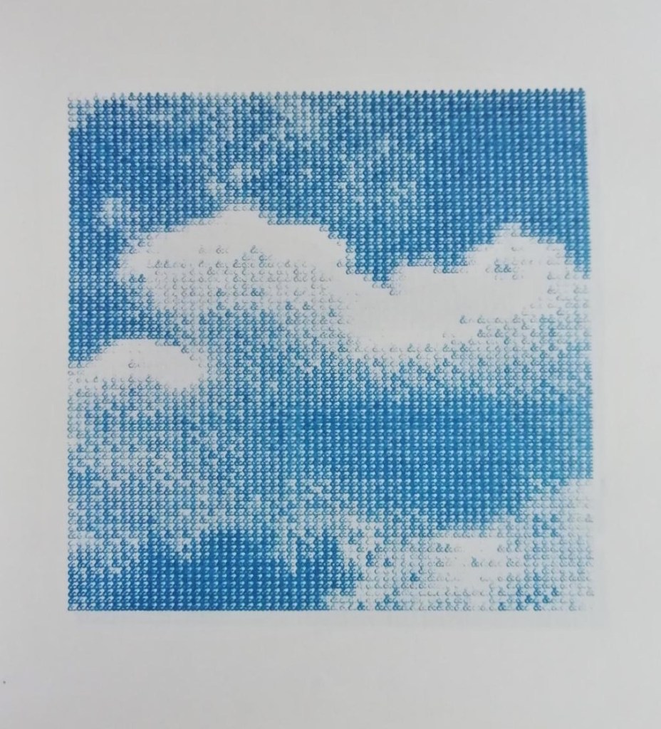 Hildebrand uses just one key on the typewriter, the ampersand, to create cloud drawings, although each one the same in scale, all again demonstrate variation within strict limitations. The sequential nature of these logogram images fit perfectly with the landscape format of the book. In the preface Hildebrand writes – “Today most of our data is stored in ‘intangible’ virtual clouds. The typed series ‘Clouds’ tries to reproduce the physical and temporal existence of these data, here symbolised by the sign Ampersand ‘&’ which is widely used in computer coding.”